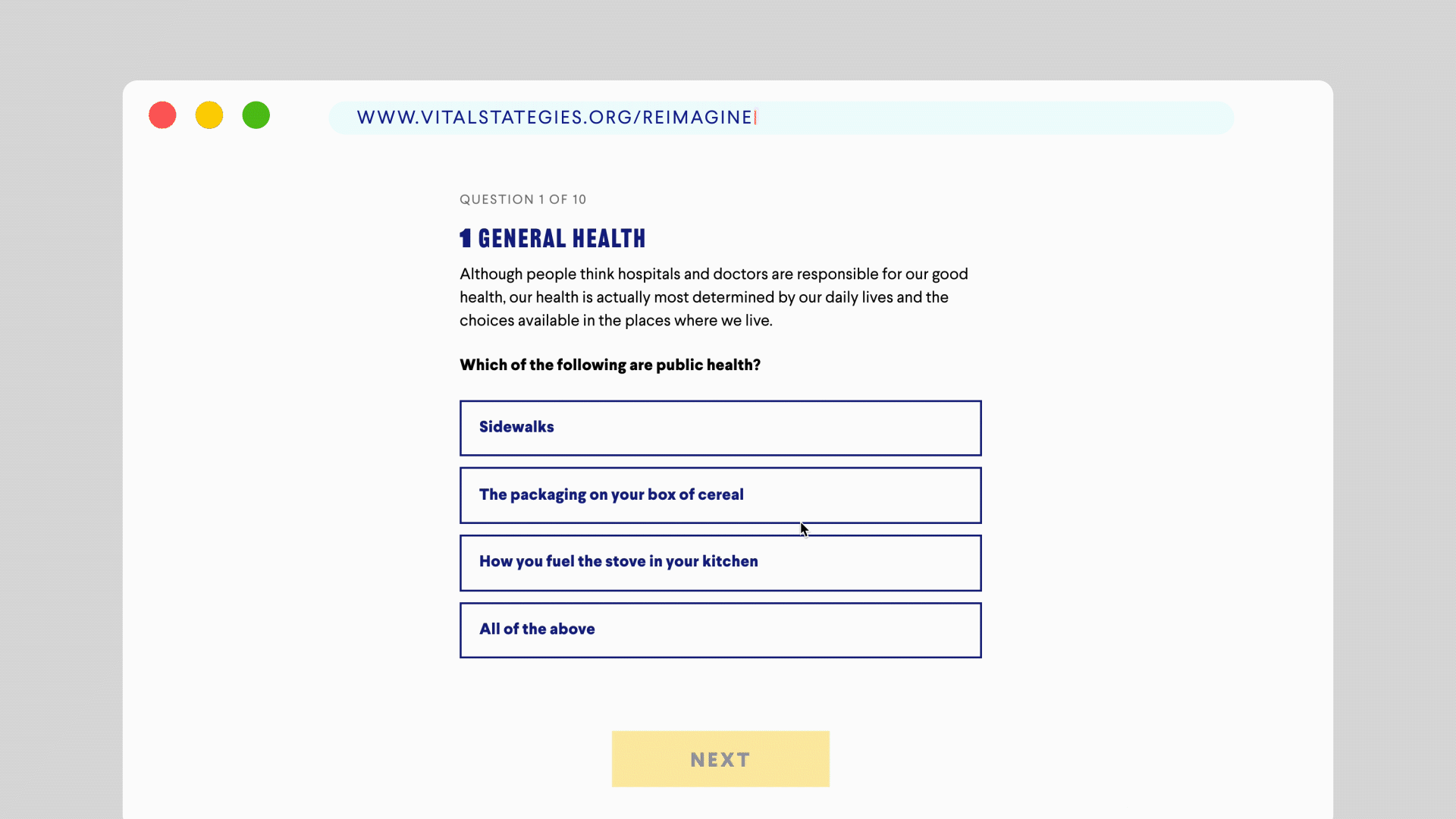 During the run of the campaign, the splash page took over the Vital Strategies homepage, asking users to watch the video, engage with the campaign on social, and take the public health knowledge quiz.